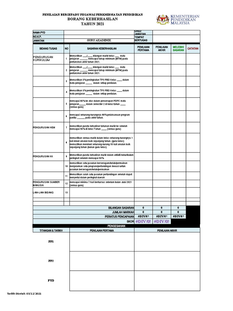 Borang ini yang telah siap akan dinilai sebanyak 2 kali setahun. Pengetua Guru Besar Pengurusan 1 Memastikan semua panitia mencapai perbelanjaan 100 bagi peruntukan yang ditetapkan. Penulisan sasaran keberhasilan perlu disesuaikan.